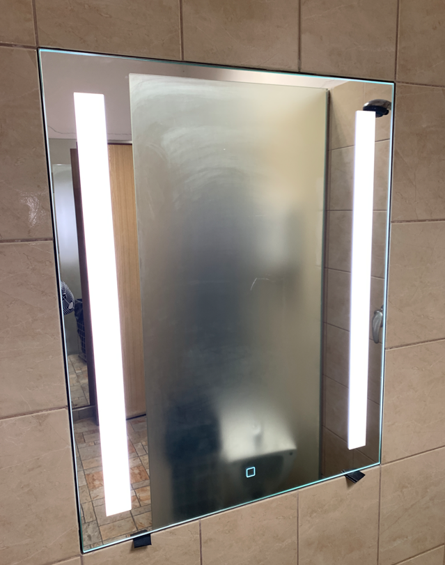 Zrcadlo se dvěma LED podsvícenými pruhy, senzorem a upevněním do obkladů prostřednictvím magnetů