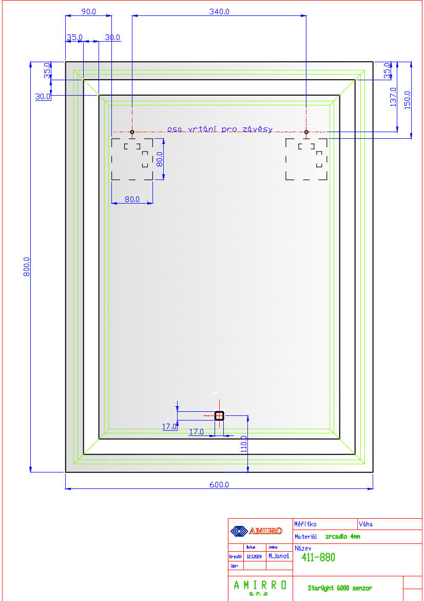 Technické specifikace: Splňuje stupeň krytí IP44, spotřeba el. energie je max. 20 WMontáž: Zrcadlo je vybaveno závěsy a příslušnými montážními prvky na zeď. U zrcadel s osvětlením doporučujeme vývod elektřiny umístit „na střed zrcadla“.