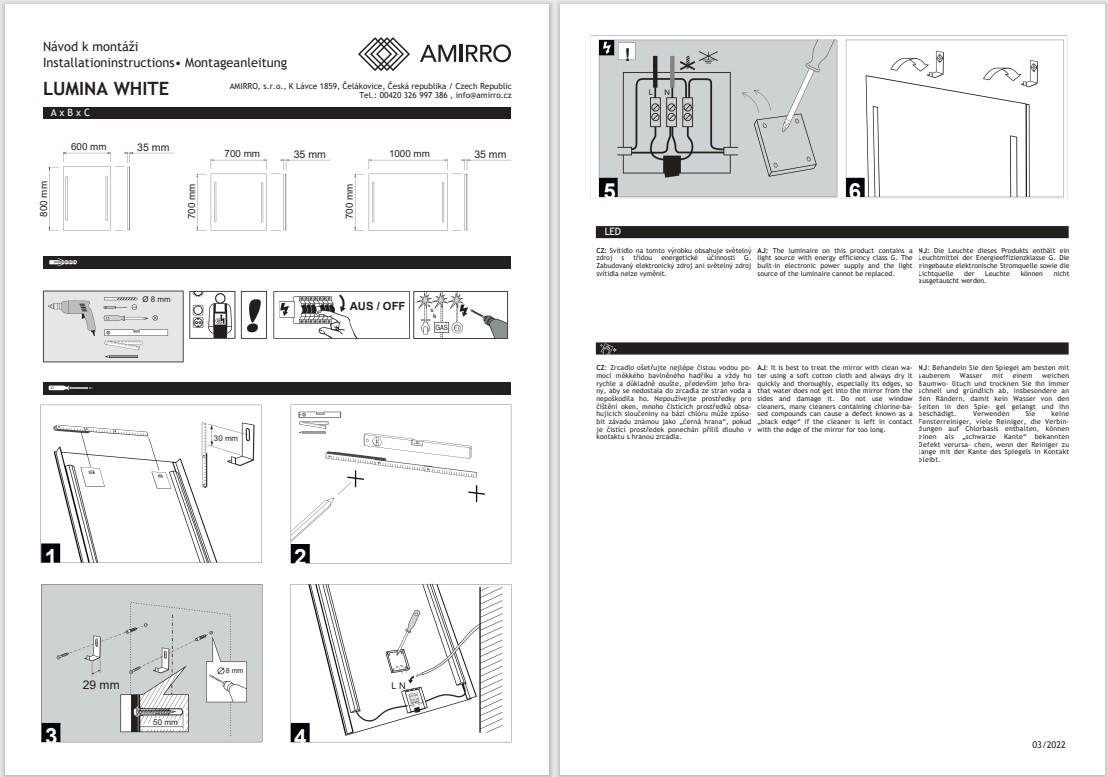 Zrcadlo Lumina White má decentní 2 cm široké podsvícené pruhy a je v provedení se zabudovaným vypínačem. Zrcadlo vyniká svou svítivostí, zdroj světla je nasměrován přímo dopředu. Navíc jednotlivé diody nejsou vidět, protože používáme zalitý led pásek a tudíž celkový vzhled zrcadla vypadá ještě lépe. Svítidlo na tomto výrobku obsahuje světelný zdroj s třídou energetické účinnosti E. Splňuje stupeň krytí IP44. Montáž: U zrcadel s osvětlením doporučujeme vývod elektřiny umístit „na střed zrcadla“.