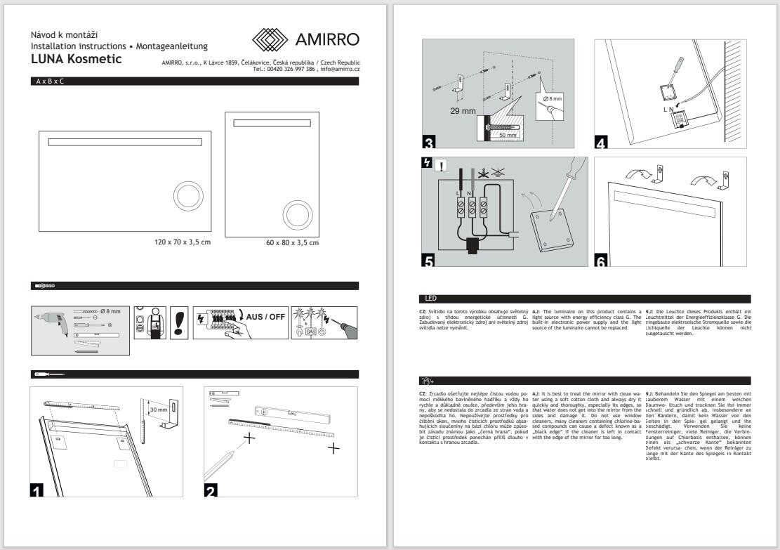 Zrcadlo Luna je osvětlené LED diodami, které vynikají svojí nízkou spotřebou a dlouhou životností a navíc se rozsvítí prakticky okamžitě. Dále zrcadlo má praktické kosmetické zrcátko, které je ideálním pomocníkem při líčení či holení. Vodorovný pruh je 4 cm široký a poskytuje tak dostatečný rozptyl světla do popředí. Osvětlená zrcadla Amirro mají navíc zdroj světla nasměrován přímo dopředu. Je v provedení s vypínačem. Svítidlo na tomto výrobku obsahuje světelný zdroj s třídou energetické účinnosti G. Splňuje stupeň krytí IP44. Montáž: U zrcadel s osvětlením doporučujeme vývod elektřiny umístit „na střed zrcadla“.