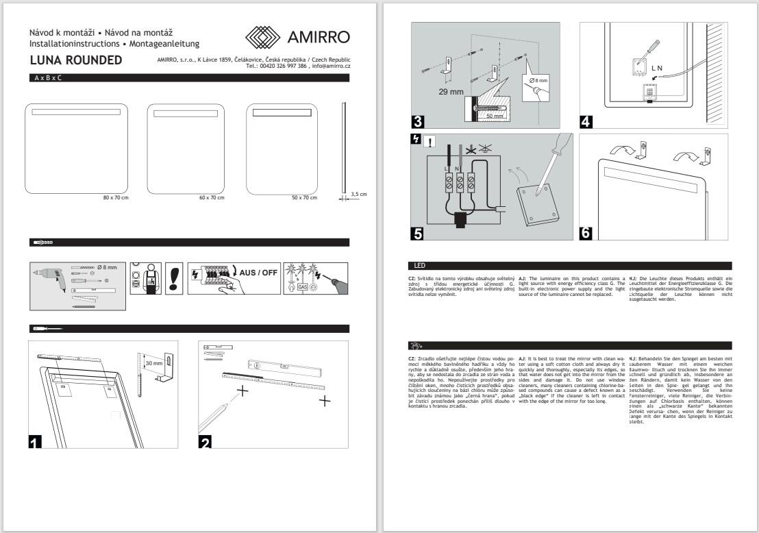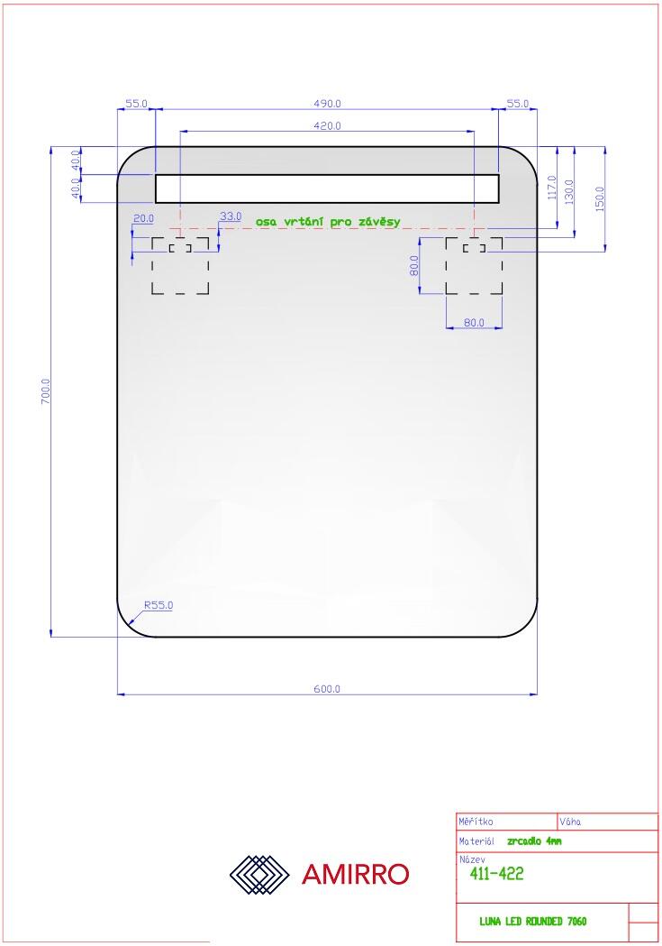 Rozměry: šířka 60 cm a výška 70 cm. Zrcadla Luna Rounded s trendy zaoblenými rohy rozzáří Váš interiér světlem, které svítí přímo do popředí. Podsvícený pruh má rozměry 49 x 4 cm a spotřeba el. energie integrovaného svítidla je 11 W. Svítidlo na tomto výrobku obsahuje světelný zdroj s třídou energetické účinnosti G. Splňuje stupeň krytí IP44. Další informace k použitému LED pásku: Barva světla: 4000 °K (neutrální). Zrcadlo je vybaveno 2 ks úchyty pro svislé zavěšení a je v provedení se stiskacím vypínačem. Celková tloušťka zrcadla včetně podsvícení je cca 3,5 cm. U zrcadel s osvětlením doporučujeme vývod elektřiny umístit „na střed zrcadla“.