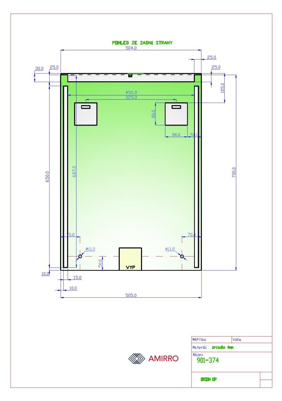Zrcadlo je vybaveno 2 ks závěsy (a příslušnými háky do zdi) pro svislé zavěšení a je v provedení s vypínačem. Celková tloušťka zrcadla včetně podsvícení je cca 3,5 cm.