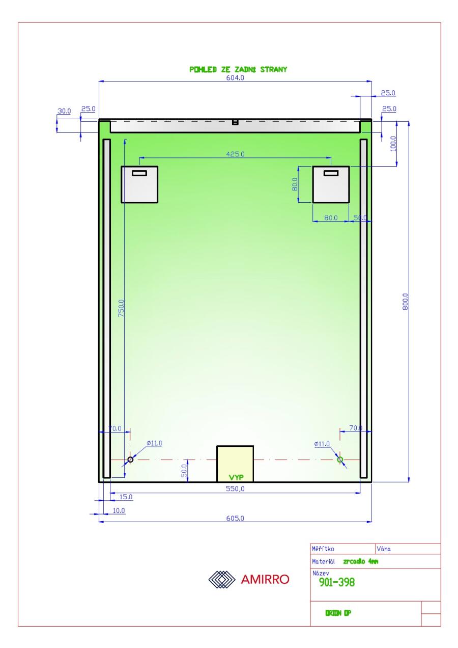 Zrcadlo je vybaveno 2 ks závěsy (a příslušnými háky do zdi) pro svislé zavěšení a je v provedení s vypínačem. Celková tloušťka zrcadla včetně podsvícení je cca 3,5 cm.