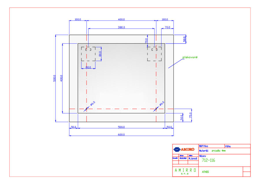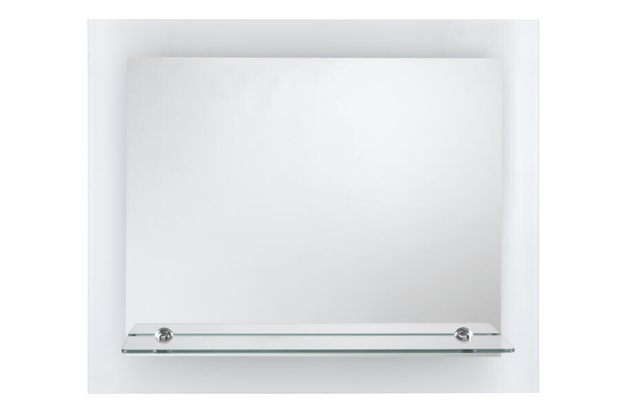 Rozměry: šířka 60 cm a výška 50 cm. Zrcadla ATHOS o síle 4 mm s poličkou o rozměrech 50 x 12 cm, ze skla silného 5 mm s leštěnou hranou, je lemované pískovaným okrajem širokým 5 cm, který vytváří efekt "mléčného skla"a dodáváme ho včetně 2 závěsů k pověšení.