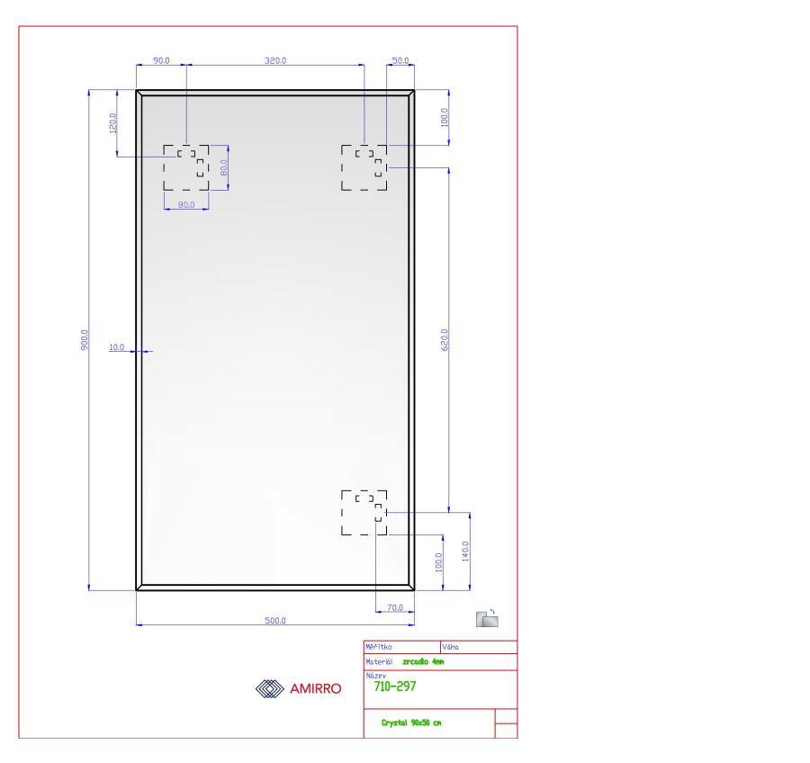 Rozměry: 50 a 90 cm. Lze pověsit na šířku i na výšku. Jednoduchá zrcadla s fazetou 10 mm. Síla zrcadla je 4 mm a je vybaveno 3 ks závěsy. Fazeta – obroušením a vyleštěním okraje zrcadla šikmo pod úhlem 4 – 20° v šířce 5 - 30 mm se vytvoří změnou úhlu odrazu optický efekt rámečku.
