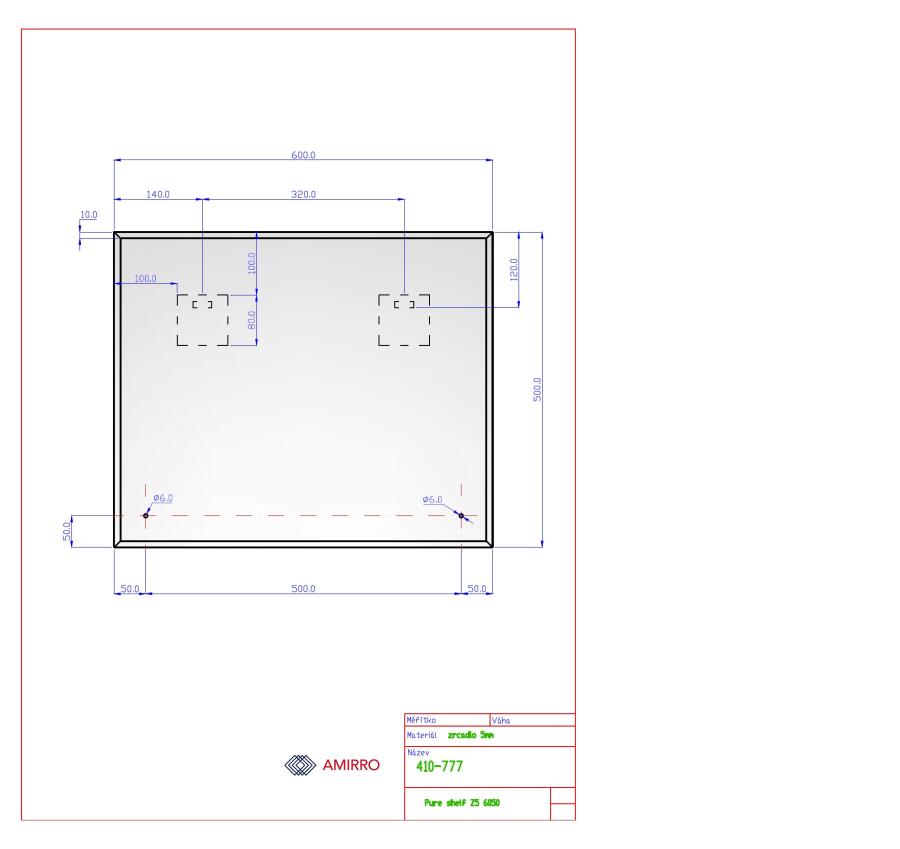 Zrcadla o síle 5 mm, šířka 60 cm a výška 50 cm, je lemované decentní lesklou hranou a vybavené poličkou o rozměrech 60 x 12 cm ze skla silného 5 mm s leštěnou hranou. Součástí jsou 2 závěsy k pověšení na šířku.