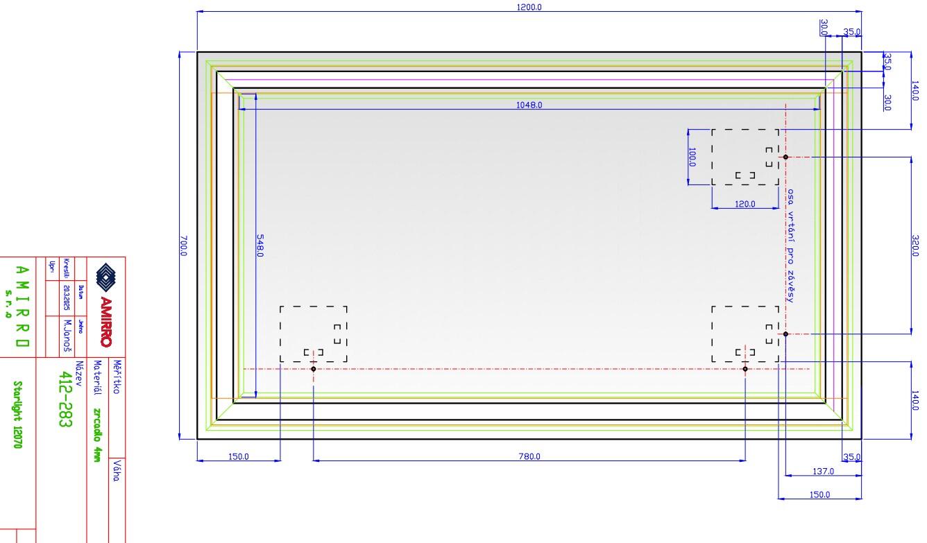 Rozměry: 120 x 70 cm. Lze pověsit na šířku i na výšku. Zrcadlo s předním LED podsvícením v černém kovovém rámu. Podsvícené pruhy vynikají obzvláště velikou svítivostí, zdroj světla je totiž nasměrován přímo na Vás a jsou tak ideálním pomocníkem při líčení či holení. Zrcadlo se rozsvěcí přímo k tomu určeným vypínačem na zdi. Zrcadlo je vybaveno závěsy i vhodnými háky na zeď. Svítidlo na tomto výrobku obsahuje světelný zdroj s třídou energetické účinnosti G. Splňuje druh ochrany IP44. Spotřeba el. energie je 22 W. Další informace k použitému LED pásku: Barva světla: 4000K, Svítivost: 2860 lm. Zrcadlo je v provedení bez vypínače a rozsvěcí se tedy k tomu určeným vypínačem na zdi. Montáž: U zrcadel s osvětlením doporučujeme vývod elektřiny umístit „na střed zrcadla“