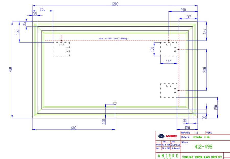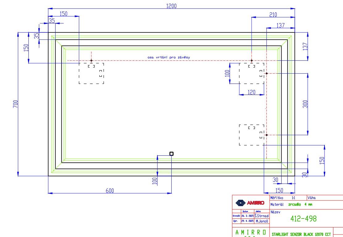Rozměry: 120 x 70 cm. Lze pověsit na šířku i na výšku. Zrcadlo s předním LED podsvícením v černém kovovém rámu. Podsvícené pruhy vynikají obzvláště velikou svítivostí, zdroj světla je totiž nasměrován přímo na Vás a jsou tak ideálním pomocníkem při líčení či holení. Zrcadlo se rozsvěcí přímo k tomu určeným vypínačem na zdi. Zrcadlo je vybaveno závěsy i vhodnými háky na zeď. Svítidlo na tomto výrobku obsahuje světelný zdroj s třídou energetické účinnosti G. Splňuje druh ochrany IP44. Spotřeba el. energie je 22 W. Další informace k použitému LED pásku: Barva světla: 4000K, Svítivost: 2860 lm. Zrcadlo je v provedení bez vypínače a rozsvěcí se tedy k tomu určeným vypínačem na zdi. Montáž: U zrcadel s osvětlením doporučujeme vývod elektřiny umístit „na střed zrcadla“