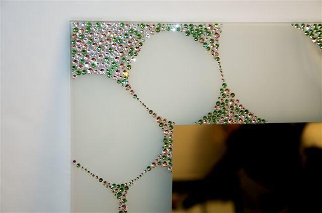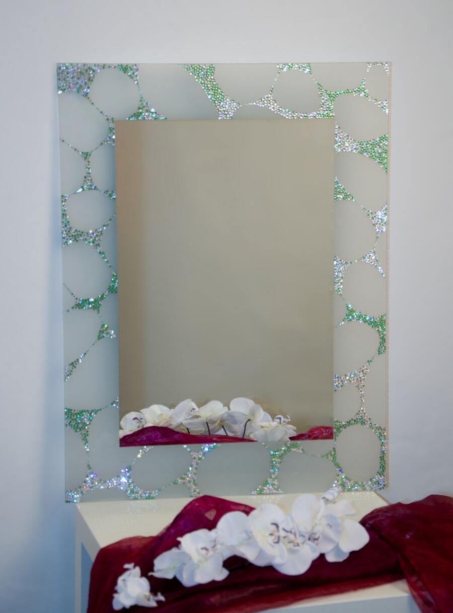 Rozměry: 80 a 60 cm. Lze pověsit na šířku i na výšku. Luxusní zrcadla o síle 4 mm s ručně lepenými kamínky Swarovski (počet kamínků: 3058) s 10 cm širokým satinovaným okrajem (mléčné sklo), které dodáváme včetně 3 závěsů pro svislé i vodorovné pověšení.