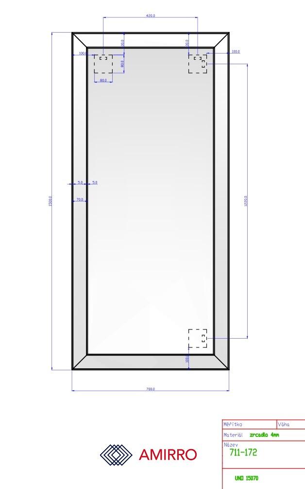 Rozměry: 70 a 150 cm. Lze pověsit na šířku i na výšku. Zrcadla o síle 5 mm zdobené 7 cm širokými lištami zdobenými strmou fazetou. Zrcadlo dodáváme včetně 3 závěsů.