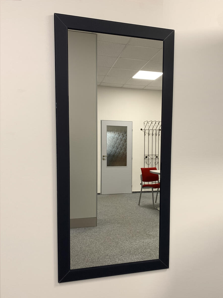 Rozměry: 70 a 150 cm. Lze pověsit na šířku i na výšku. Zrcadla zdobené matnými fazetovanými (decentní strmá fazeta) 7 cm širokými lištami tzv. matelac v odstínu černá antracit je vhodným designovým dopňkem k oblíbeným černým koupelnovým doplňkům. Zrcadlo je vybavené závěsy a příslušnými montážními prvky na zeď. Výrobu zrcadla nabízíme i v atypických rozměrech dle přání zákazníka.