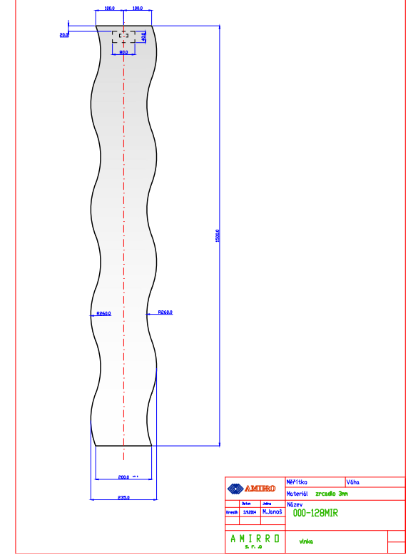 Rozměry: šířka 20 cm a výška 150 cm. Zrcadla o síle 3 mm, 1 vlnka, broušené hrany, včetně závěsu. Uváděný rozměr 20cm je pro šířku opsaného obdélníku, samotné zrcadlo ma šířku vlnky 15cm.