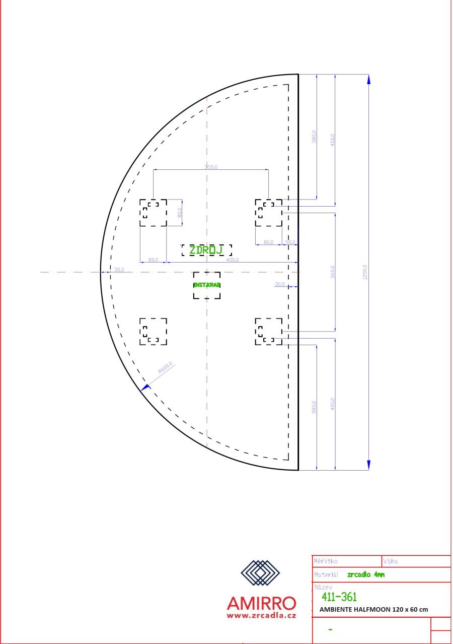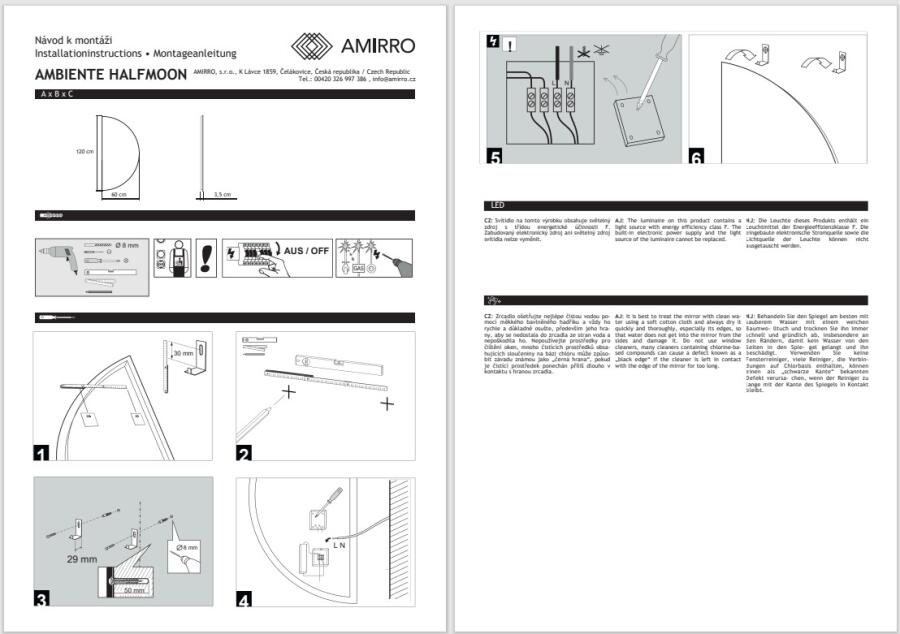 Rozměry: 120 cm a 60 cm. Zrcadla s příjemným LED podsvícením do stran, po celém obvodu, je vybaveno závěsy i vhodnými háky na zeď. Svítidlo na tomto výrobku obsahuje světelný zdroj s třídou energetické účinnosti F. Splňuje druh ochrany IP44. Spotřeba el. energie je 28 W. Další informace k použitému LED pásku: Barva světla: 4000 °K (neutrální). Svítivost: 3640 lm. Zrcadlo je v provedení bez vypínače a rozsvěcí se tedy k tomu určeným vypínačem na zdi. Lze pověsit na šířku i na výšku. Montáž: U zrcadel s osvětlením doporučujeme vývod elektřiny umístit „na střed zrcadla“. Celková tloušťka zrcadla včetně podsvícení je cca 3,5 cm.