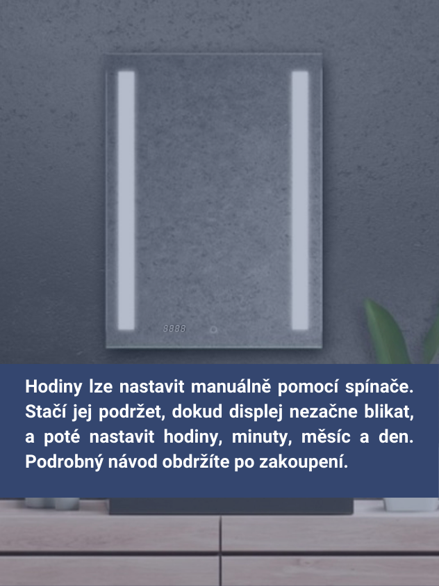 Zrcadlo o rozměrech 60 × 80 cm s digitálními hodinami a moderním LED podsvícením přináší praktické využití. Podsvícené pruhy o rozměrech 70 × 4 cm poskytují příjemné a rovnoměrné osvětlení. Jemně podsvícený senzor ve spodní části zrcadla umožňuje snadné zapnutí, i když je tma a digitální hodiny vám zajistí přehled o čase.