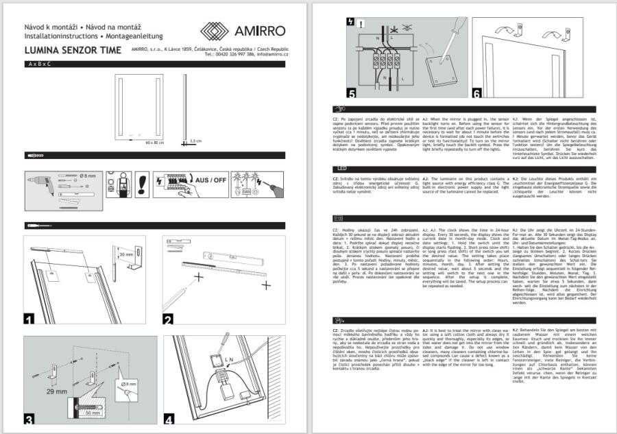 Snadná montáž: Součástí jsou závěsy a příslušný háky na zeď. U zrcadel s osvětlením doporučujeme vývod elektřiny umístit „na střed zrcadla“.
