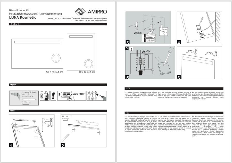 Zrcadlo Luna vyniká svou svítivostí, zdroj světla je nasměrován přímo dopředu. Dále zrcadlo má praktické kosmetické zrcátko, které je ideálním pomocníkem při líčení či holení. Navíc jednotlivé diody nejsou vidět, protože používáme zalitý led pásek a tudíž celkový vzhled zrcadla vypadá ještě lépe. LED diody vynikají svojí nízkou spotřebou a dlouhou životností a navíc se rozsvítí prakticky okamžitě. Vodorovný pruh je 4 cm široký a poskytuje tak dostatečný rozptyl světla do popředí, jsou tedy ideálním pomocníkem při líčení či holení. Je v provedení s vypínačem. Svítidlo na tomto výrobku obsahuje světelný zdroj s třídou energetické účinnosti G. Splňuje stupeň krytí IP44. Montáž: U zrcadel s osvětlením doporučujeme vývod elektřiny umístit „na střed zrcadla“.